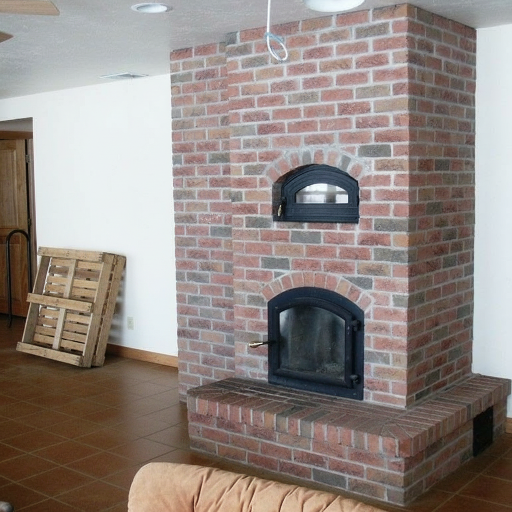 Для кладки печей, если речь идет о реальном использовании, применяется не декоративный кирпич, а самый обычный строительный. В итоге конструкция не выглядит эстетичной.